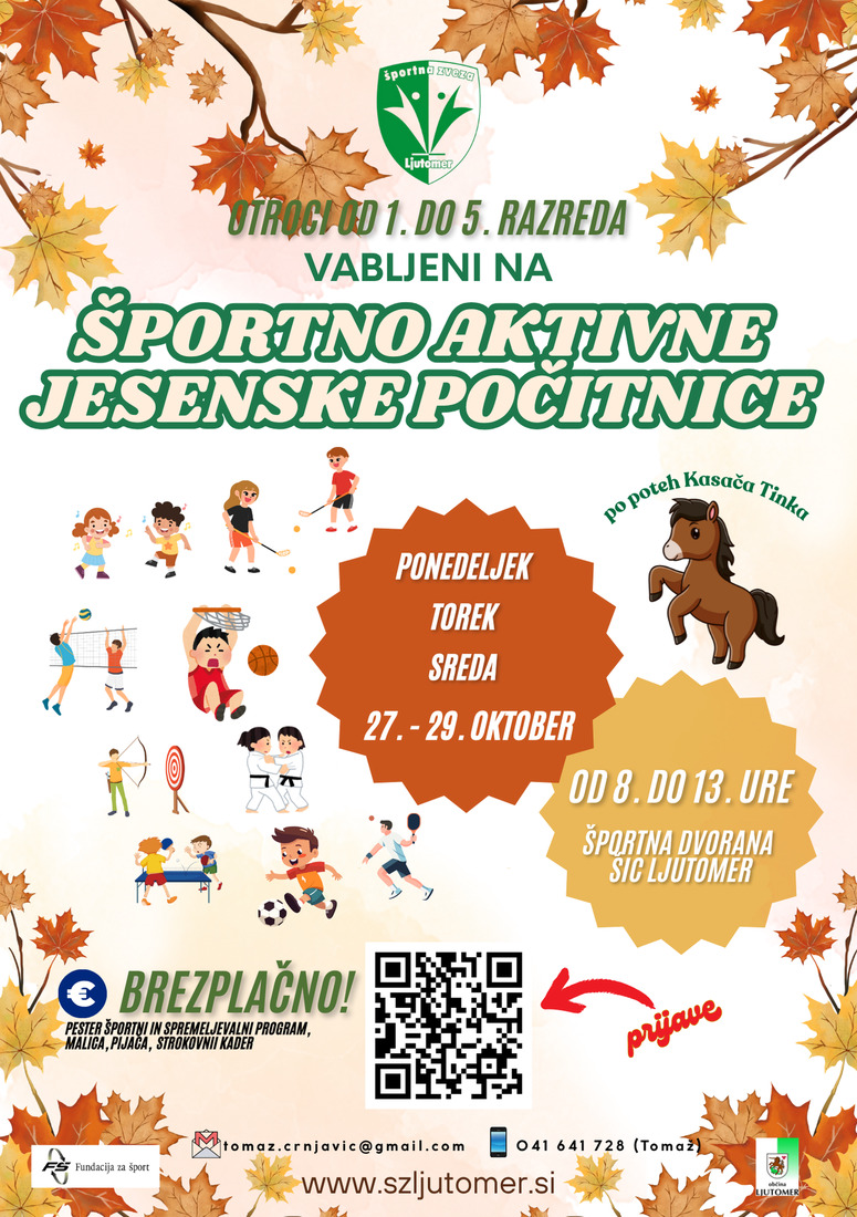 Športna zveza Ljutomer bo v ponedeljek, torek in sredo (27.-29.10.2025), v času jesenskih počitnic, med 8. in 13. uro v dvorani ŠIC Ljutomer poskrbela za številne športne aktivnosti. Podrobnosti so na priloženem letaku.