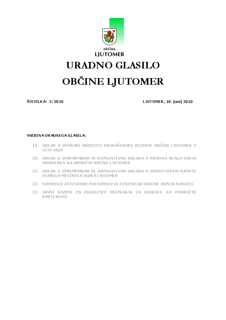 Odlok o uporabi sredstev proračunske rezerve Občine Ljutomer v letu 2010 (Uradno glasilo Občine Ljutomer, 3/2010)